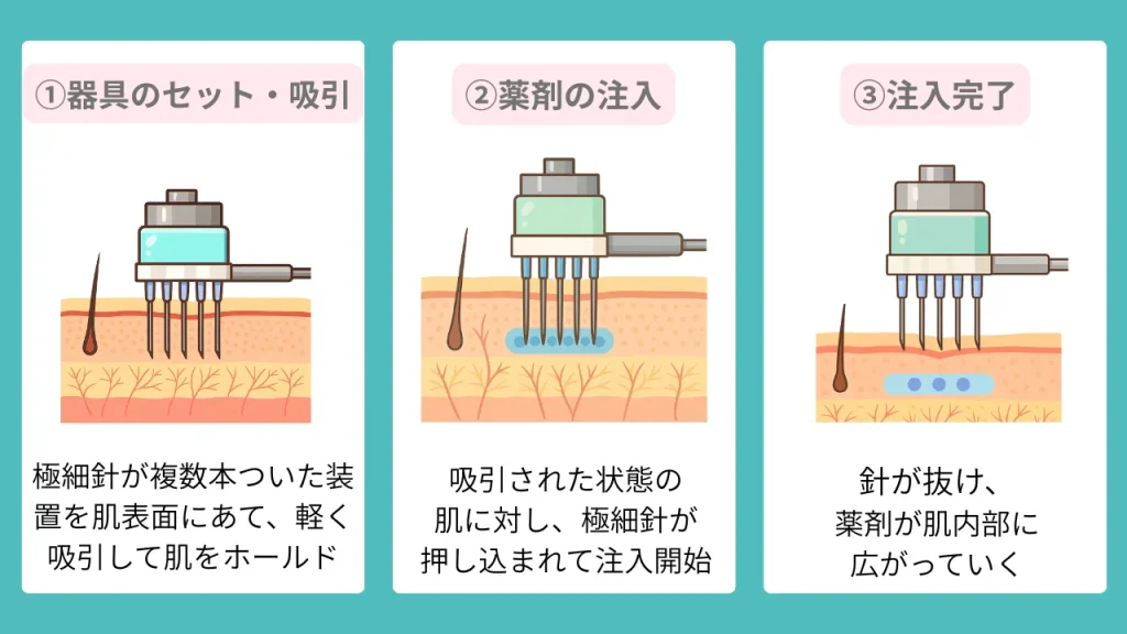 5本針タイプで痛みが少なく、敏感肌の方にも適している。吸引圧を利用して皮膚を持ち上げながら注入するため、より浅い層へ正確に薬剤を届けられる。