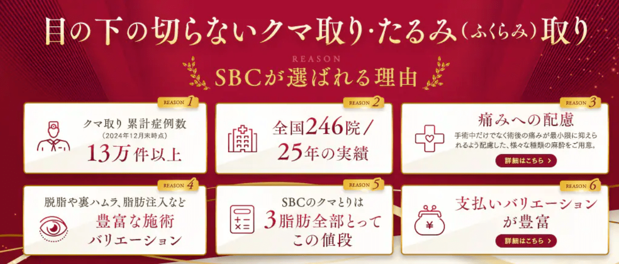 第一印象はとても良かったので、糸リフトとクマ取りの施術のためSBCを選びました。営業のご担当者様と医者様もご対応は非常に丁寧で、安心感を伝えました。しかし、施術後の目の下の内出血は治るまで長い時間がかかってしまいましたし、個人差のため、ほうれん草の糸リフトと脂肪注入の仕上がりは予想と違い期待に添えなく、施術前よりあまり変わっていないと感じていますので今回は残念でした。おそらく再度施術することになるかと思います。ただ、このクリニックの対応は非常に良いので、また整形することになりましたら改めてSBCにするかと思います。今後とも宜しくお願い致します。