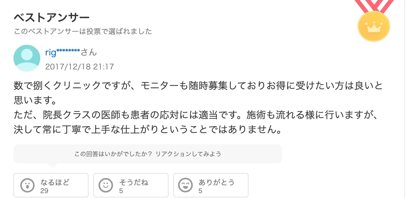数で捌くクリニックですが、モニターも随時募集しておりお得に受けたい方は良いと思います。 ただ、院長クラスの医師も患者の応対には適当です。施術も流れる様に行いますが、決して常に丁寧で上手な仕上がりということではありません。